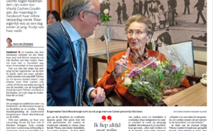Vandaag in het Haarlems Dagblad, een mooie reportage over de 108e verjaardag van mevrouw Castien. Mevrouw Castien woont sinds enkele jaren in Huis in de Duinen. Ter ere van haar 108e verjaardag kwam burgemeester David Moolenburgh op bezoek.