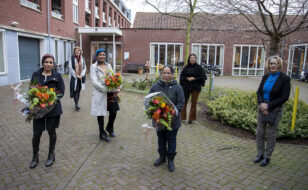 Bestuurders Audrey van Schaik van Kennemerhart en Talitha van den Elst van het Nova College hebben vrijdag het zorgspeldje overhandigd aan Rania, Sharon en Marites, voor de deur van woonzorglocatie Overspaarne.