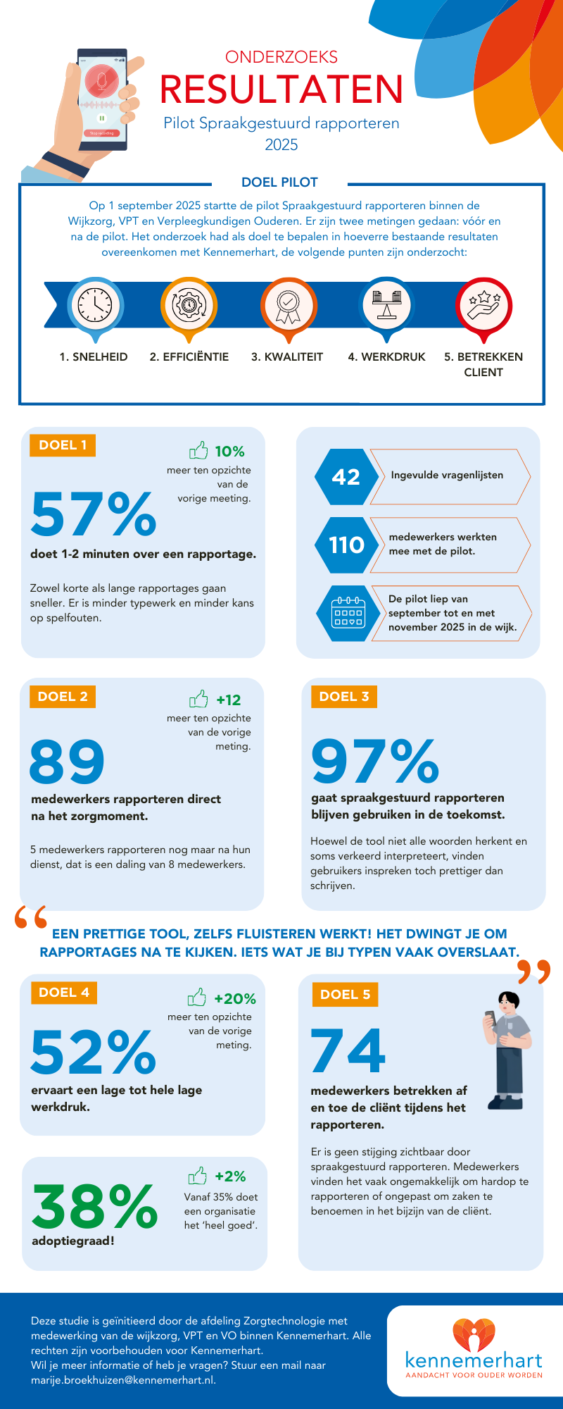 De pilot liet zien dat collega’s van de wijkzorg, Volledig Pakket Thuis (VPT), en Verpleegkundige Ouderen (VO) sneller en vaker direct na het zorgmoment rapporteren, met als resultaat een lagere werkdruk. Ook blijkt dat rapportages duiderlijkere zinnen en minder spel- of grammatica fouten bevatten. In de pilotgroep werd 17% van alle rapportages spraakgestuurd gedaan en maakte 38% van de deelnemers gebruik van de tool – een opvallend hoge score in de sector.