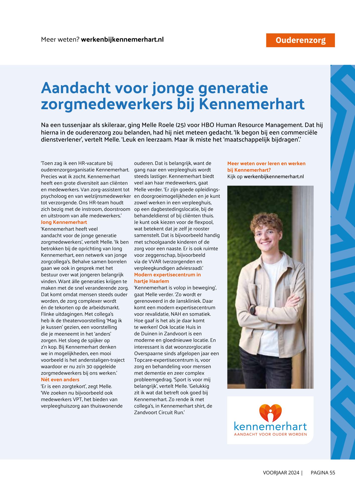 Deze dagen verschijnt in het ‘100% Zorg en Welzijn magazine’ een artikel over Aandacht voor de jonge generatie zorgmedewerkers bij Kennemerhart. Melle Roele (25) is er hr-adviseur. In het blad vertelt hij over hoe het is om als jongere te werken in de ouderenzorg.