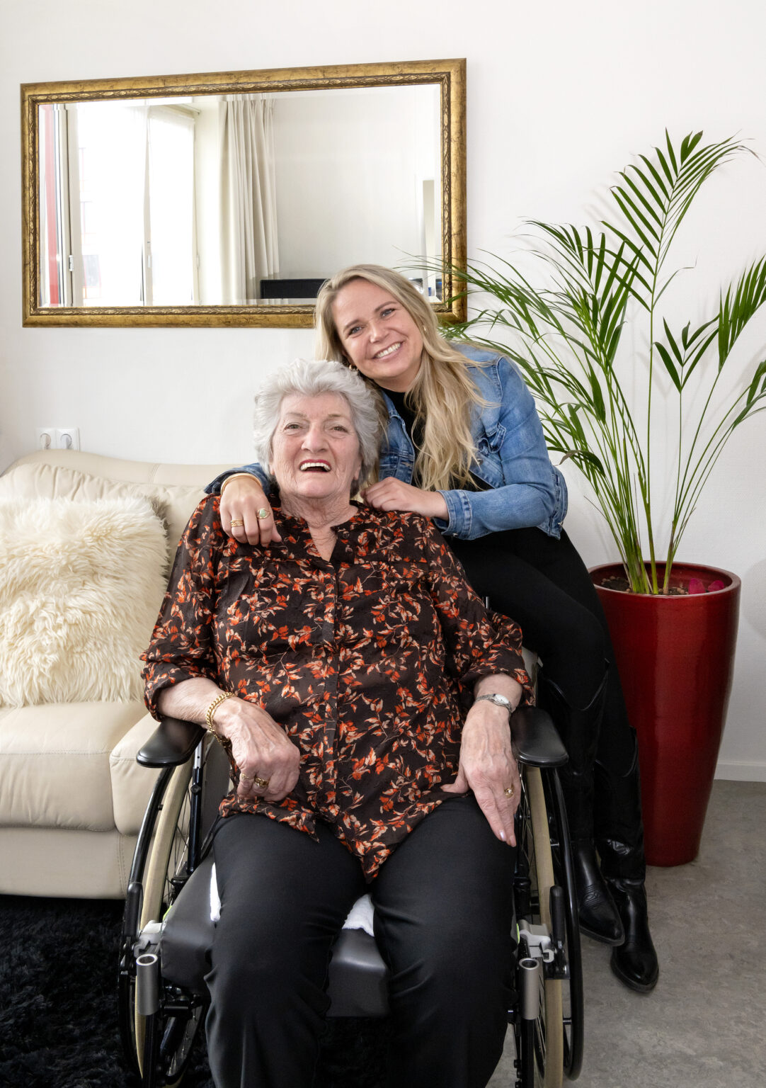 Sinds vier jaar woont Tinie Terpstra (82) op woonzorglocatie Schoterhof in Haarlem-Noord. “Tinie kent hier iedereen. En iedereen kent Tinie”, vertelt teambegeleider Cyrianne. “Ze zit vaak aan de tafel bij de receptie te kletsen met alle mensen die langskomen.” “Beter dan de hele dag in mijn appartement zitten”, vindt mevrouw Terpstra, die graag Tinie genoemd wordt. Zeker door Cyrianne, met wie ze een warme band heeft. “Je had mijn dochter kunnen zijn.” “Vanaf het eerste moment dat je hier woont, hebben we goed contact”, zegt Cyrianne. “We lachen veel, ook bij de douchebeurten. Als je samen lachend de dag begint, dat geeft het leven kleur.” Wat Cyrianne bijzonder maakt? “Ze is lief en luistert goed”, vindt Tinie. “Ik kan alles bij haar kwijt.” “En ik kan soms mijn hart luchten bij jou”, aldus Cyrianne. “Jij kunt jezelf zijn bij mij, en ik bij jou.” Wel wil ze iets benadrukken. “Ook al hebben we een goede band, ik blijf altijd professioneel. En ik behandel Tinie niet anders dan de andere bewoners.” Speciaal voor het interview kwam Cyrianne op haar vrije dag naar Schoterhof. “Tinies dochter heeft net ons haar gedaan. Zij is toevallig ook mijn kapster.”