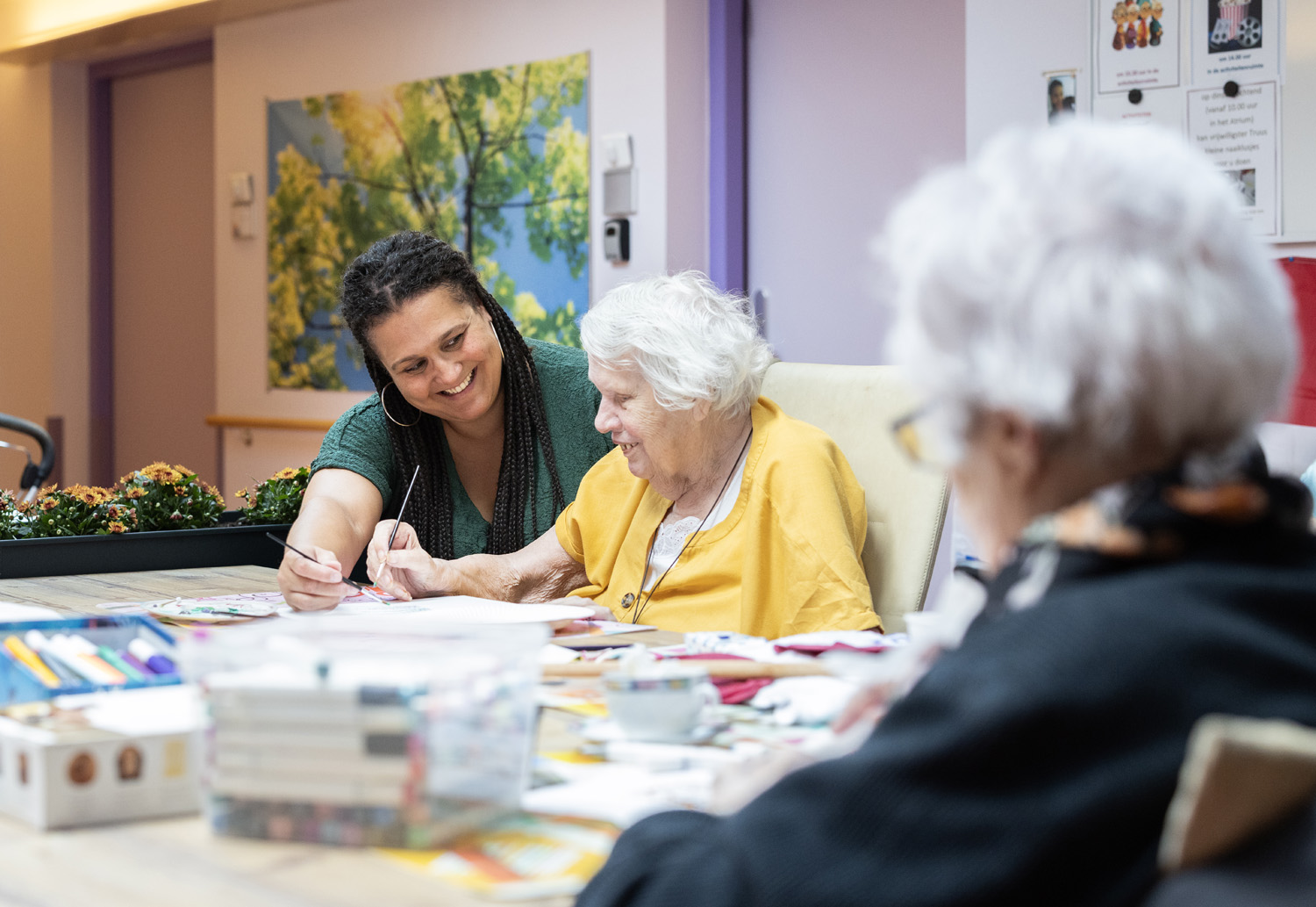 Als Marjolein een huiskamer binnenloopt, ziet ze vaak gezichten oplichten. “Dan vraagt een bewoner: ‘Jij bent toch van de muziek? Is er vandaag weer wat leuks te doen?’ Dan gaat mijn hart open”, vertelt Marjolein, coördinator welzijn bij het Reinaldahuis. “Met ons team organiseren we alle activiteiten in het huis. Van grote optredens in het atrium tot spelletjes in de huiskamer en individuele activiteiten. Want sommige bewoners hebben behoefte aan één op één contact.”